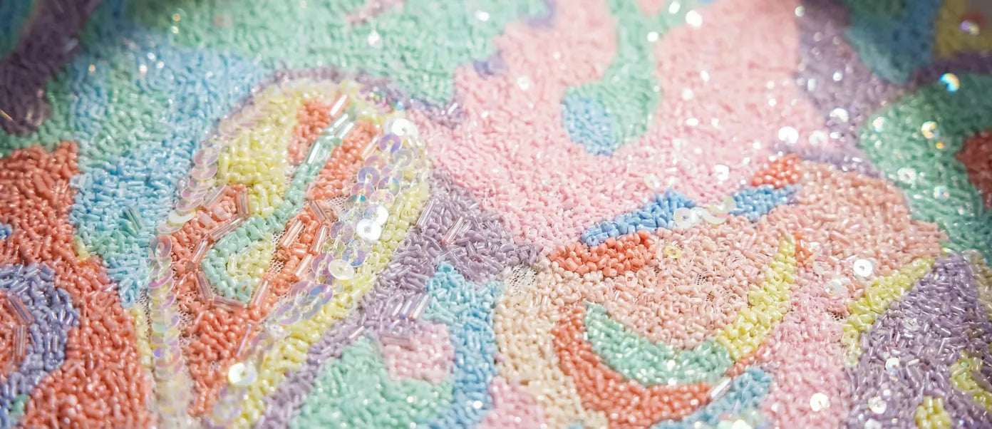 Intricate beadwork and crystal embellishment carefully applied to create unmistakable Oceanus pieces.