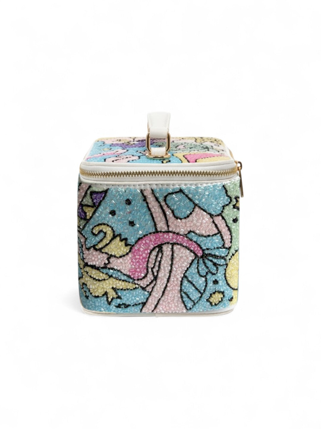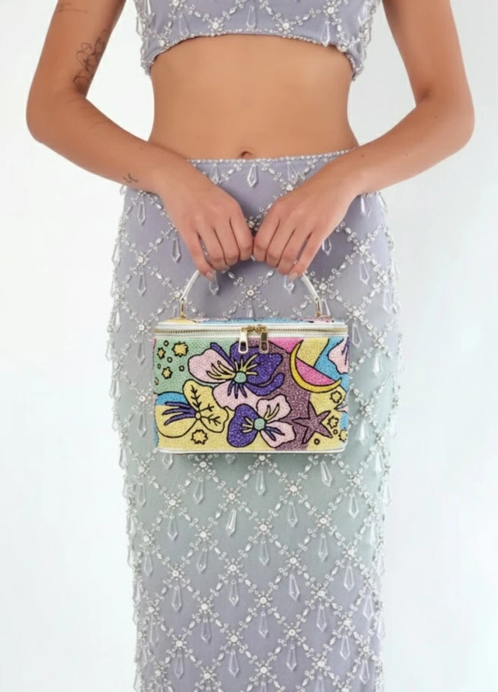 This chic vanity-style bag features a built-in mirror and a detachable shoulder strap, beautifully adorned with hand-embellished sea creatures. A perfect blend of elegance and craftsmanship, it’s your new statement accessory for any occasion.