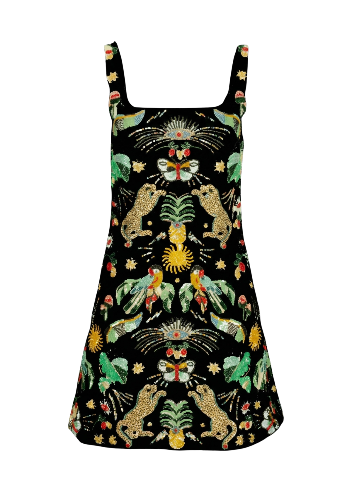 The Aurelia Black Embroidered Mini Dress is a tropical-inspired cocktail dress featuring hand-embroidered motifs on eco-friendly Italian Lycra. Perfect for summer parties, luxury evenings, and chic holiday events, this sustainable sequin mini dress offers a figure-flattering fit and Oceanus’s signature exotic elegance.