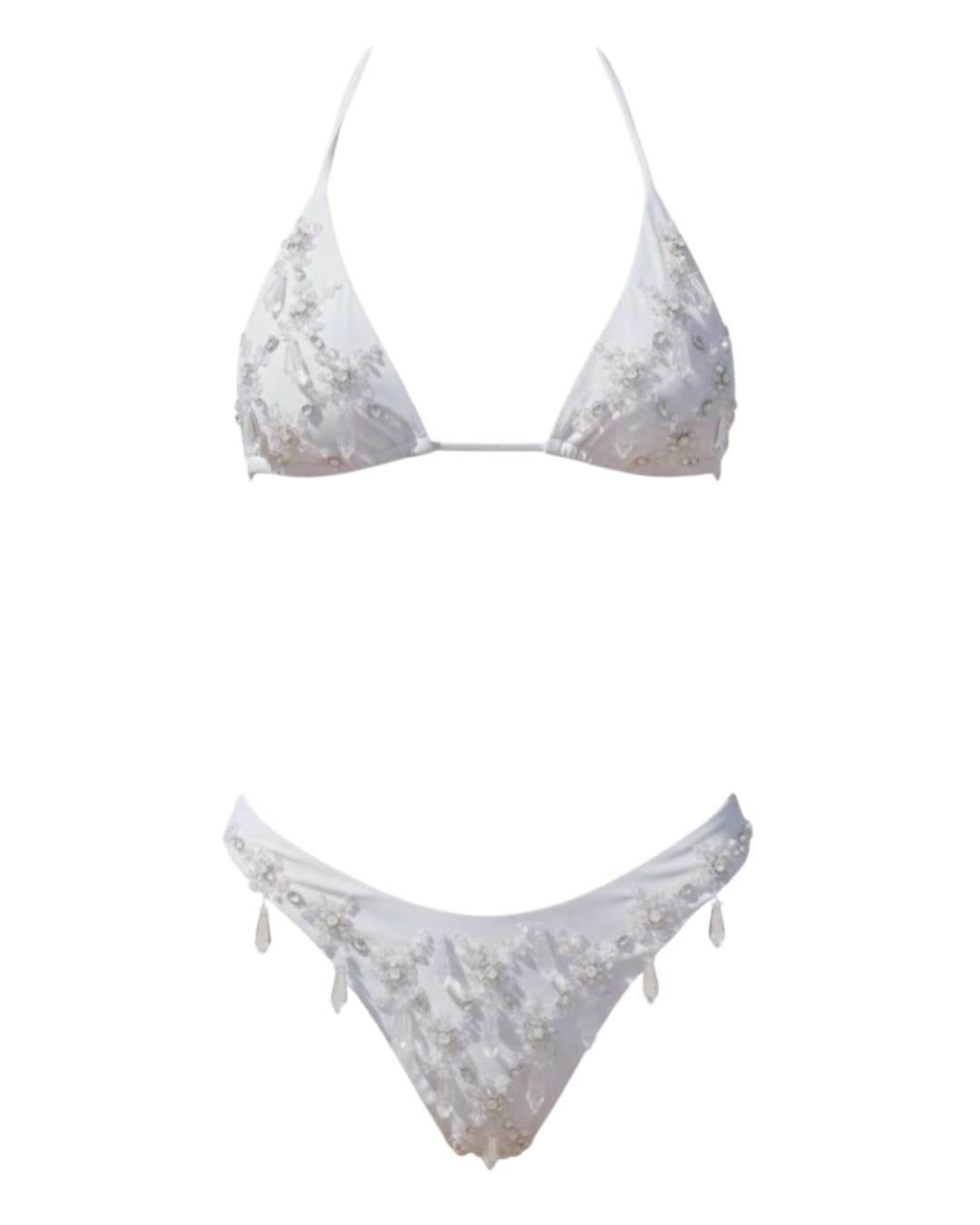 Embrace sun-drenched elegance with the Calliope Luxury Crystal Bikini Bottom in White—a signature style that embodies the essence of Oceanus. Crafted from premium Lycra for a perfect fit and all-day comfort, this piece showcases a front panel adorned with oversized crystal beads that catch the light like sea foam at sunrise. The smooth, unembellished back panel creates a sleek silhouette, while the slip-on design ensures effortless wear. Designed to sit perfectly on the hips, these bottoms hug your curves in all the right places, making them your new go-to for poolside glamour and beachside allure.