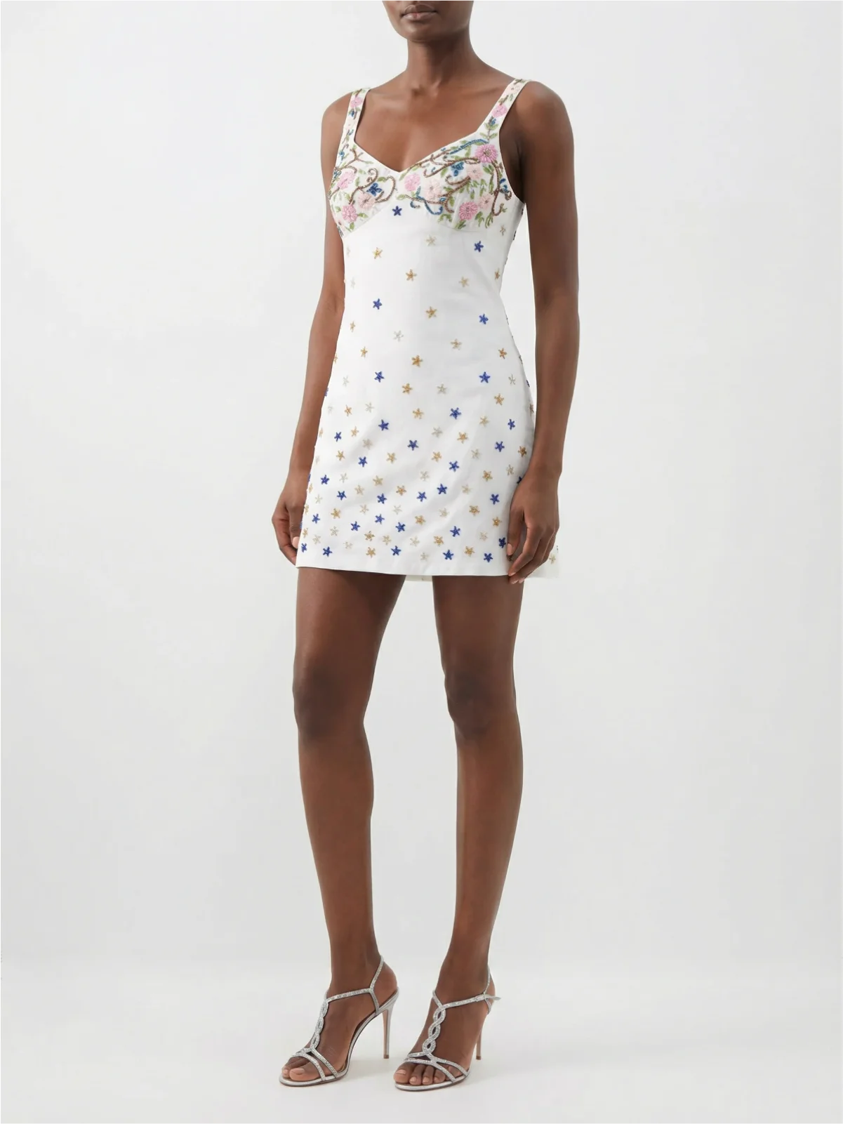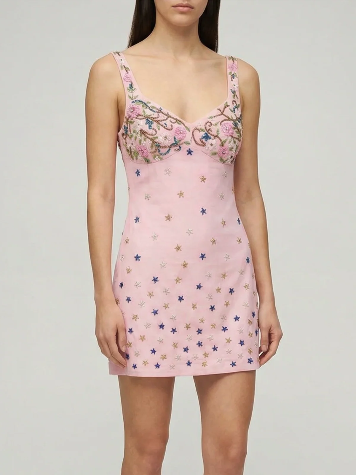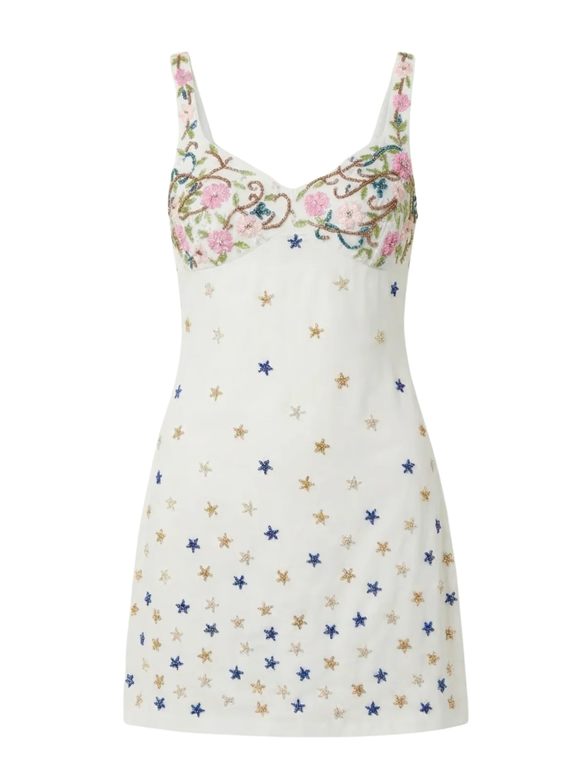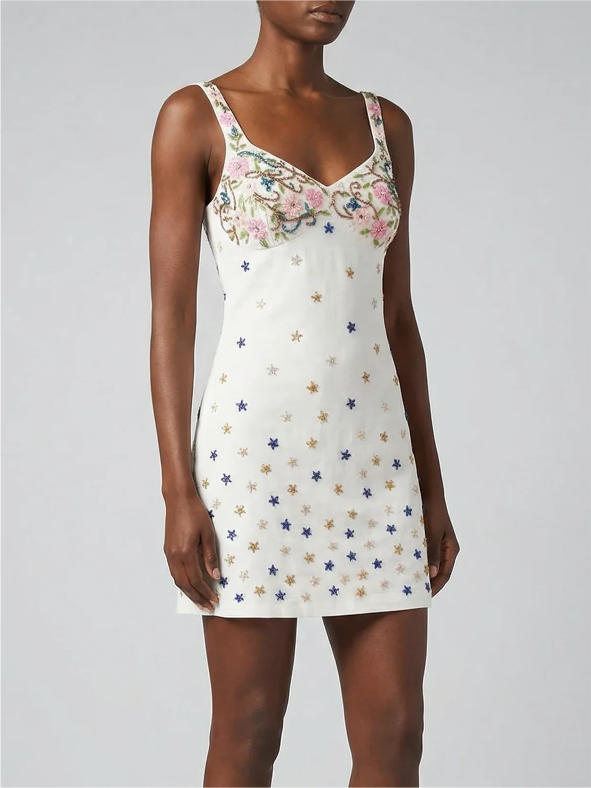 A timeless mini dress elevated with delicate embroidery and subtle detailing. Designed with a flattering V-neckline and wide shoulder straps, this piece gently skims the body for an effortlessly feminine silhouette. Intricate floral embroidery adorns the bust, while scattered star motifs add a soft, romantic touch throughout the dress.