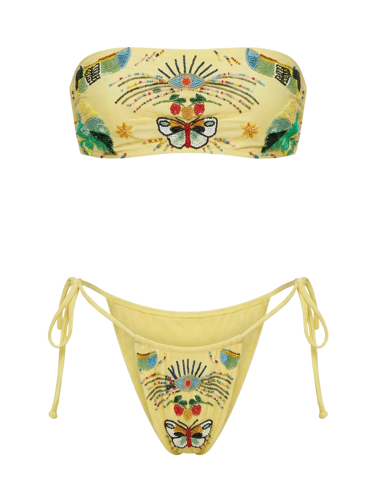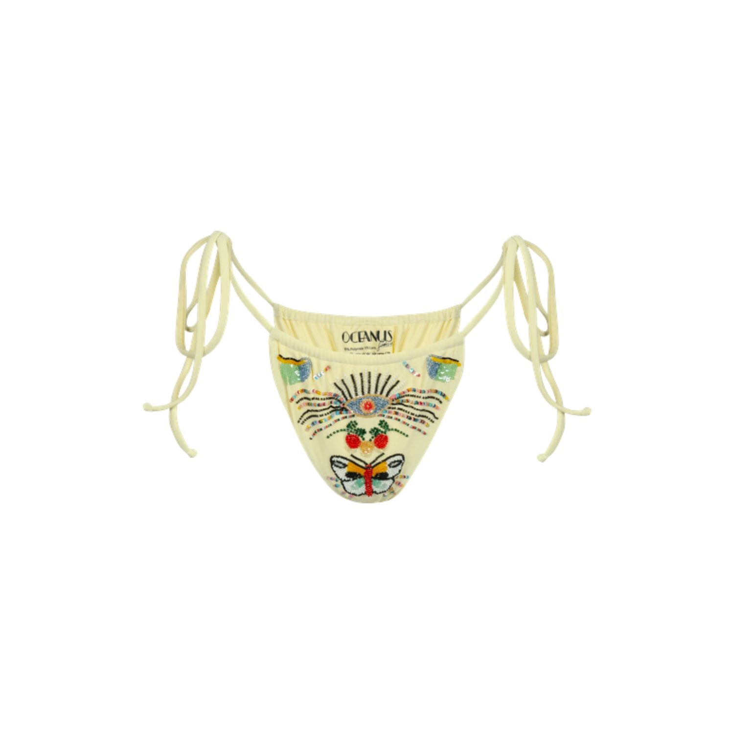 Playful, feminine, and effortlessly eye-catching — this embellished tie-side bikini bottom is designed to make a statement. Crafted in a soft pastel yellow hue, this piece features intricate hand-beaded embroidery that adds vibrant color and artistic detail to your swimwear collection.