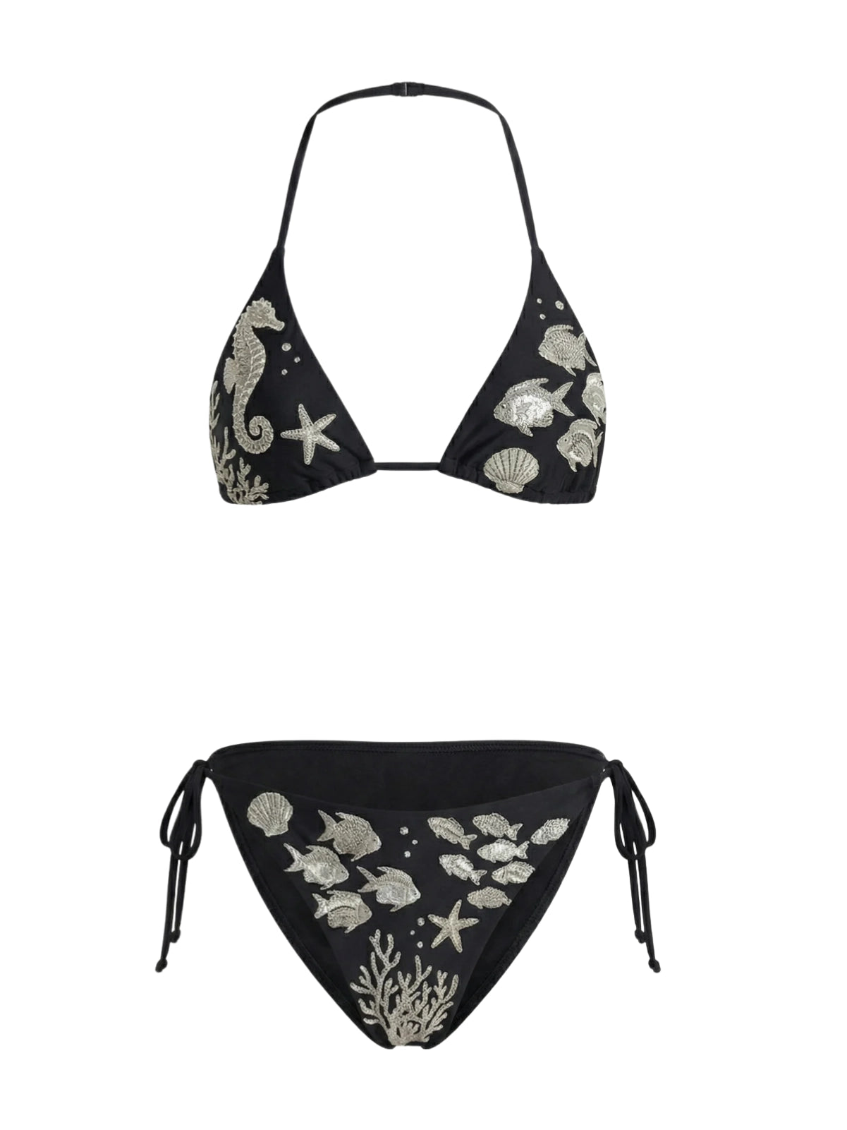 Coraline Embellished Triangle Bikini Top A luxe triangle top adorned with hand-finished embellishments that capture the essence of oceanic elegance. Designed for comfort and confidence, this piece pairs seamlessly with coordinating bottoms or stands alone as a statement swim essential. Perfect for those who refuse to compromise on style or quality.