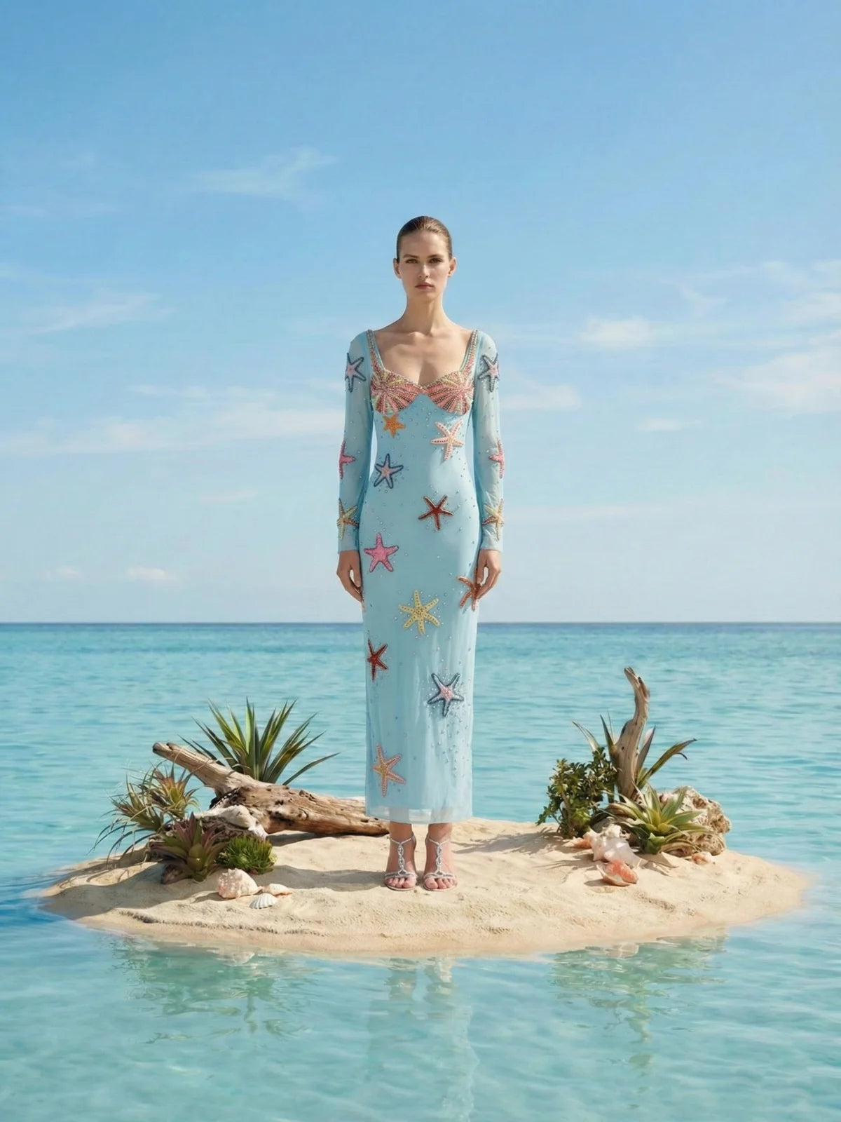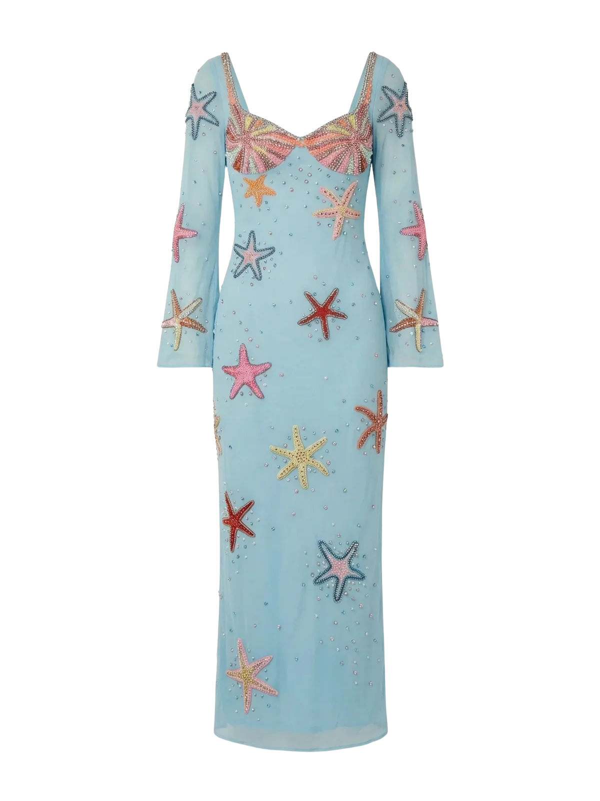 Hand-beaded shell-inspired maxi dress featuring elegant bell sleeves and crystal embellishments. A luxurious ocean-inspired evening gown ideal for resort events, beach weddings and sunset celebrations.