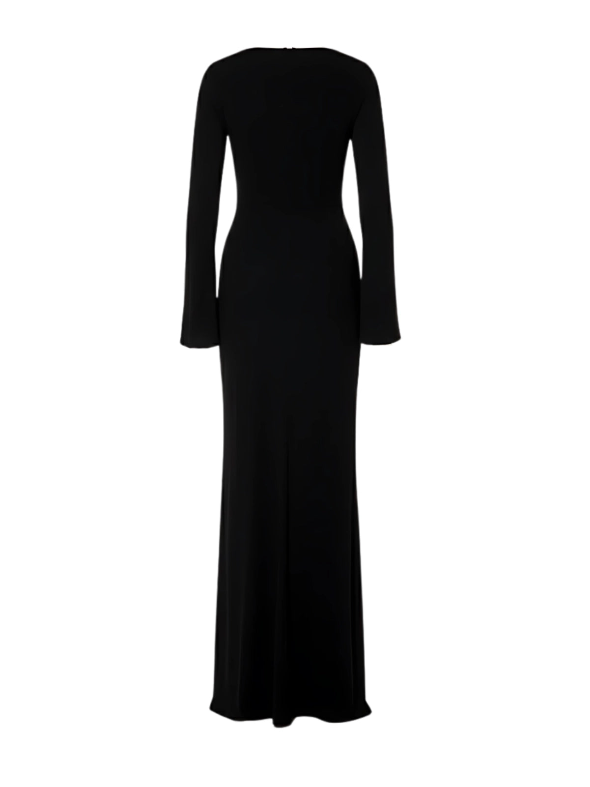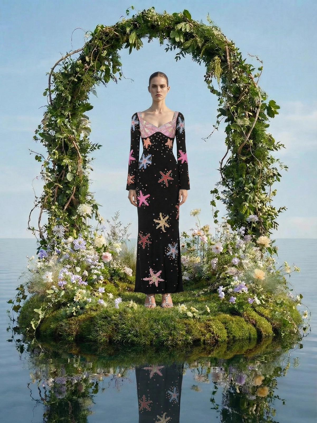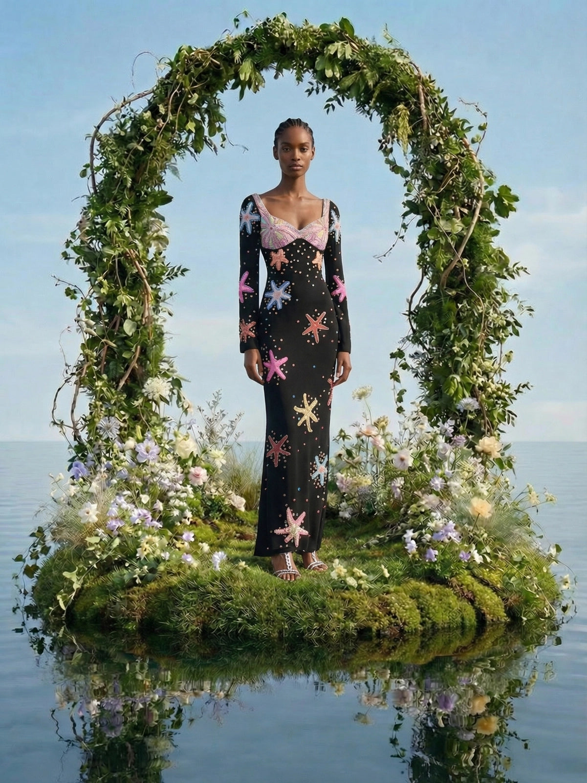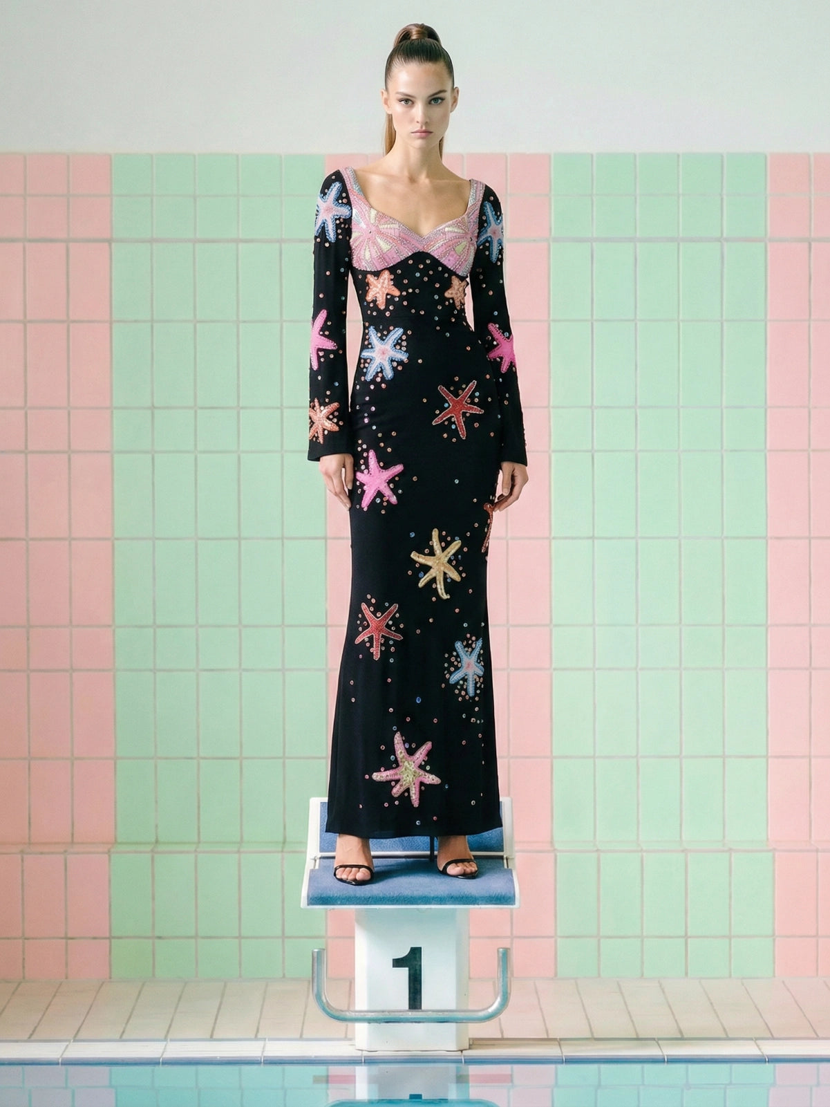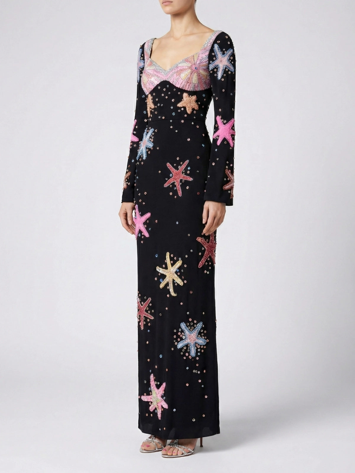 Make a striking entrance with this stunning embellished evening gown, designed to capture the magic of the ocean in every detail. Crafted on a sleek black base, the dress features hand-applied beadwork in vibrant shades of pink, gold, lilac, and aqua, forming sparkling starfish motifs that create an enchanting underwater-inspired look. The fitted silhouette flatters the figure, while the beautifully embellished bust and long sleeves add a refined, luxurious touch. Perfect for formal events, galas, or special celebrations, this gown delivers both elegance and bold artistic flair—ideal for anyone who wants to stand out effortlessly.