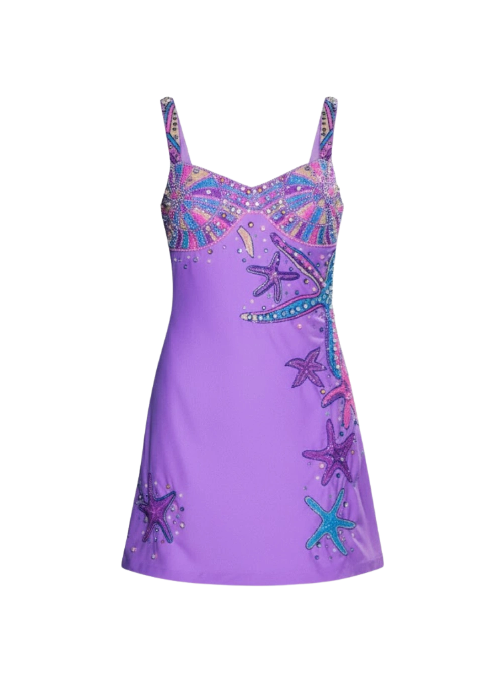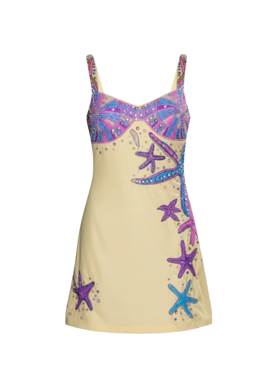 Hand-crafted shell & starfish beaded mini dress with shimmering straps and a flattering sweetheart neckline. A bold ocean-inspired designer dress perfect for beach weddings, summer parties, and resort nights. Where oceanic wonder meets modern sensuality, the Crescent Shell Mini Dress embodies the spirit of Oceanus’s signature craftsmanship. Crafted in London, this piece features a econyl base adorned with hand-placed shells and starfish beading in delicate hues. The beadwork is concentrated at the chest and trickles gracefully down, creating an irresistible play of shimmer and light. Even the straps glisten with delicate beading, ensuring every detail captivates. Designed with a seductive neckline that flatters the décolletage, this mini dress is the ultimate statement of summer sophistication and artistry.