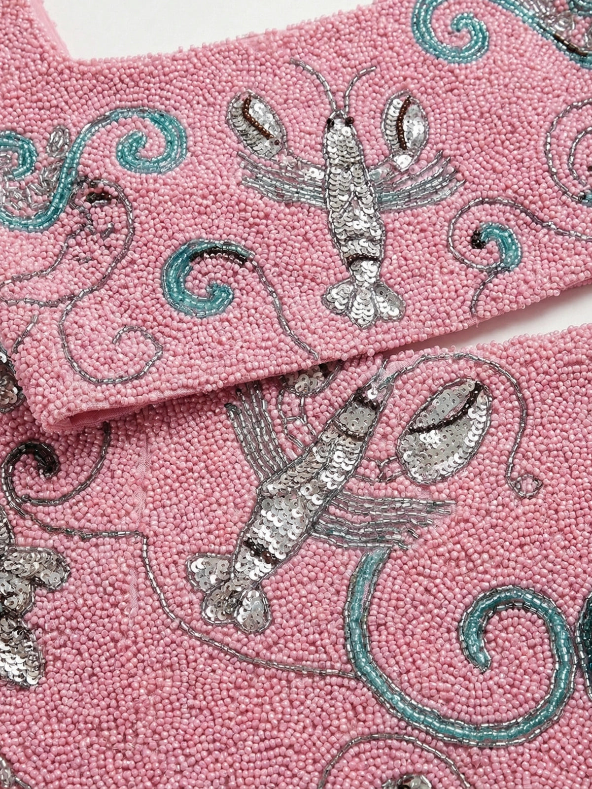Make a statement in this showstopping piece from the SS25 Runway Collection. Crafted in luxurious pink tones, this beaded cropped top features swirling ocean-inspired embellishments and a playful lobster motif, capturing the spirit of Miami tides.