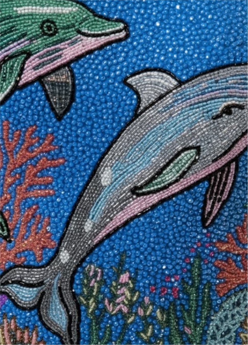 Dive into elegance with this hand-embellished Oceanus swimsuit, featuring dazzling dolphins and vibrant coral reef embroidery across a shimmering ocean-blue base. Crafted with meticulous beadwork and sustainable luxury materials, this one-piece captures the spirit of the sea — perfect for resort escapes, poolside glamour, or statement summer style.