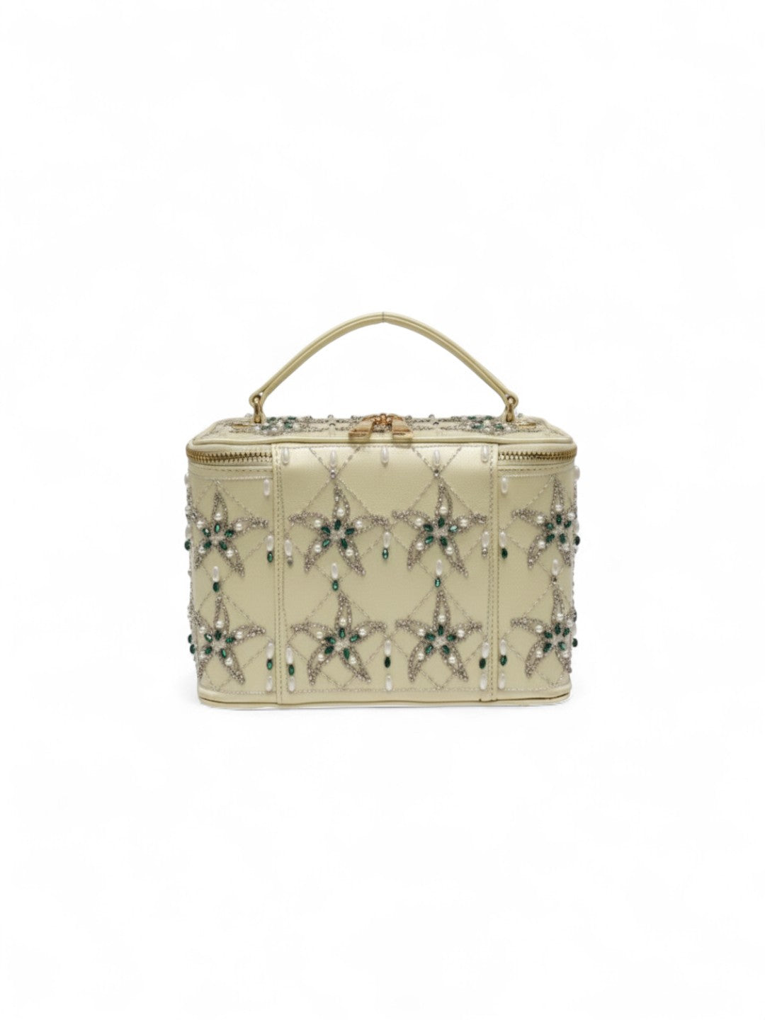 This chic vanity-style bag features a built-in mirror and a detachable shoulder strap, beautifully adorned with hand-embellished elements. A perfect blend of elegance and craftsmanship, it’s your new statement accessory for any occasion.