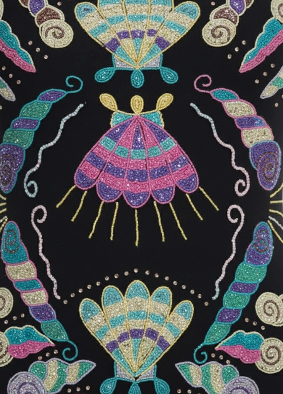 Elevate your beachwear with the Oceanus x Zandra Rhodes Dreamy Dreamy One Piece Shell Swimsuit in Black. Hand-beaded and handmade in London, this luxury designer swimsuit features a flattering scoop neckline, sleek Lycra base, and intricate shell-inspired beadwork. As seen on the runway at Miami Swim Week SS25, it’s the perfect blend of runway swimwear, luxury resort wear, and statement one-piece swim style.