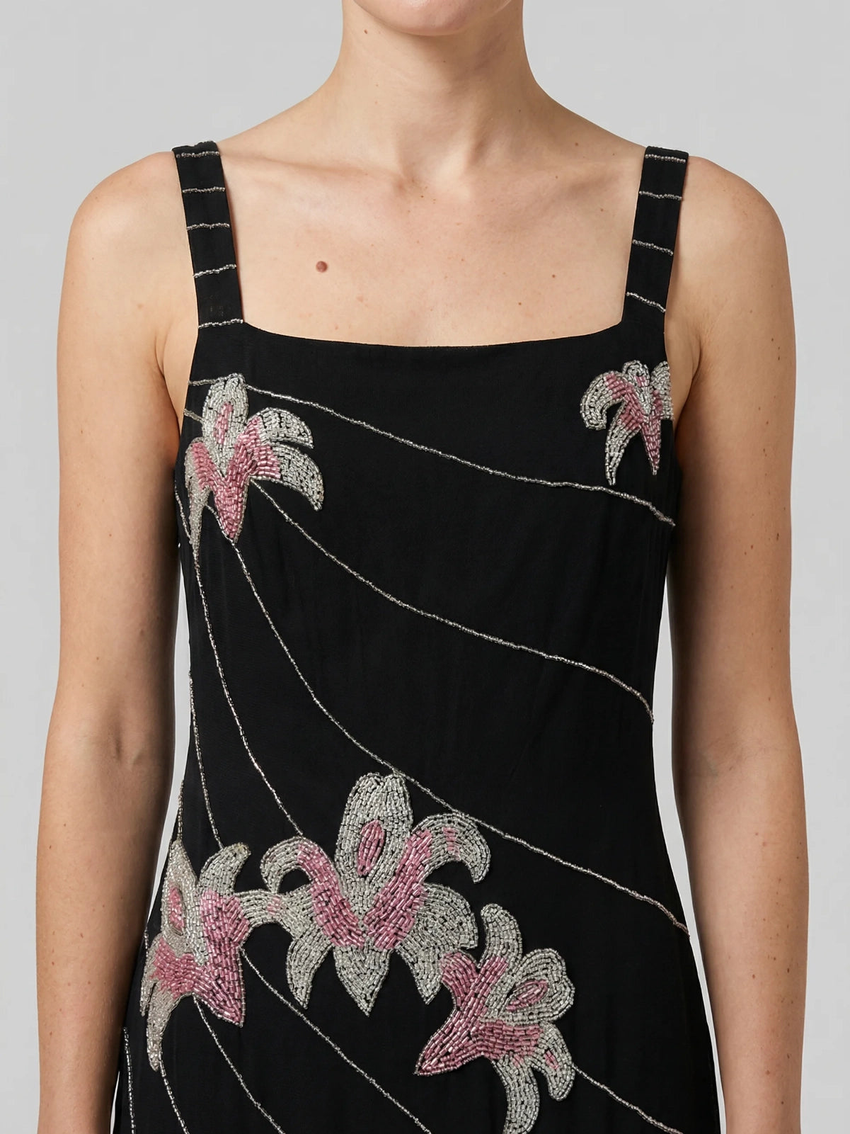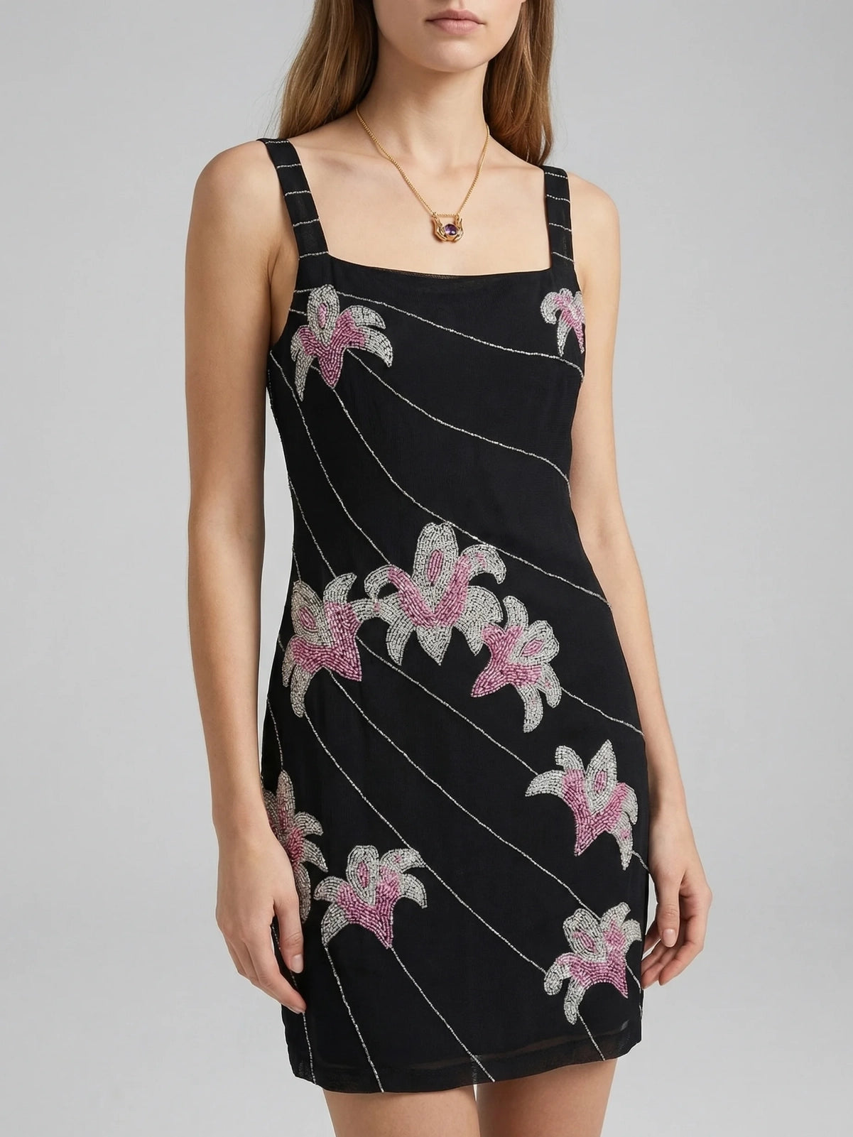 A refined mini dress that blends elegance with artistic detailing. Crafted in a sleek black silhouette, this piece features delicate floral beadwork arranged across soft diagonal lines, creating a beautiful sense of movement and texture.