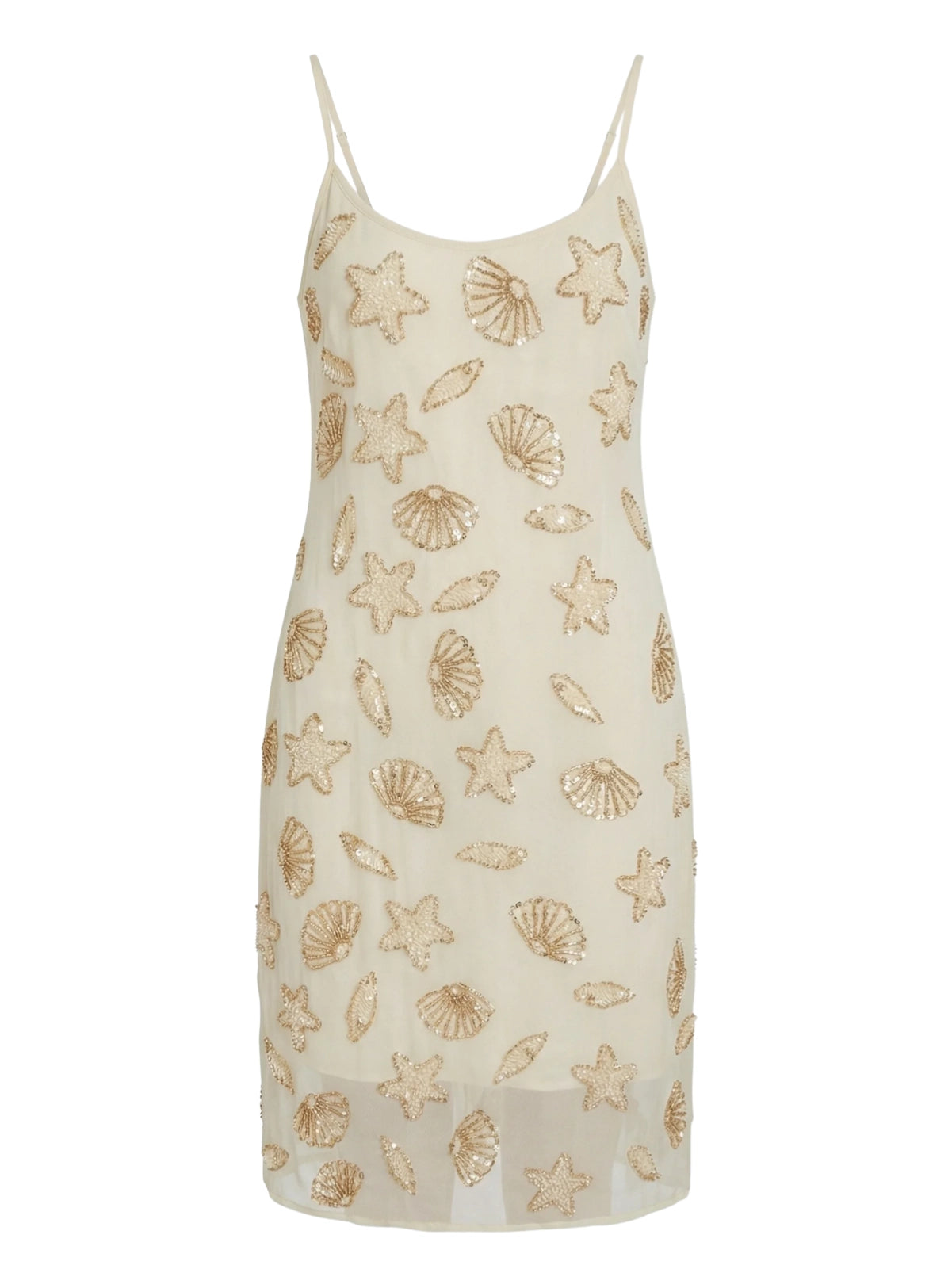 Elegant, light, and effortlessly refined, this ivory slip dress is designed to bring a touch of coastal-inspired glamour to your wardrobe. Crafted from a delicate sheer fabric, the dress is beautifully adorned with hand-applied bead and sequin embellishments featuring starfish and seashell motifs. The subtle shimmer catches the light with every movement, creating a sophisticated yet playful look.
