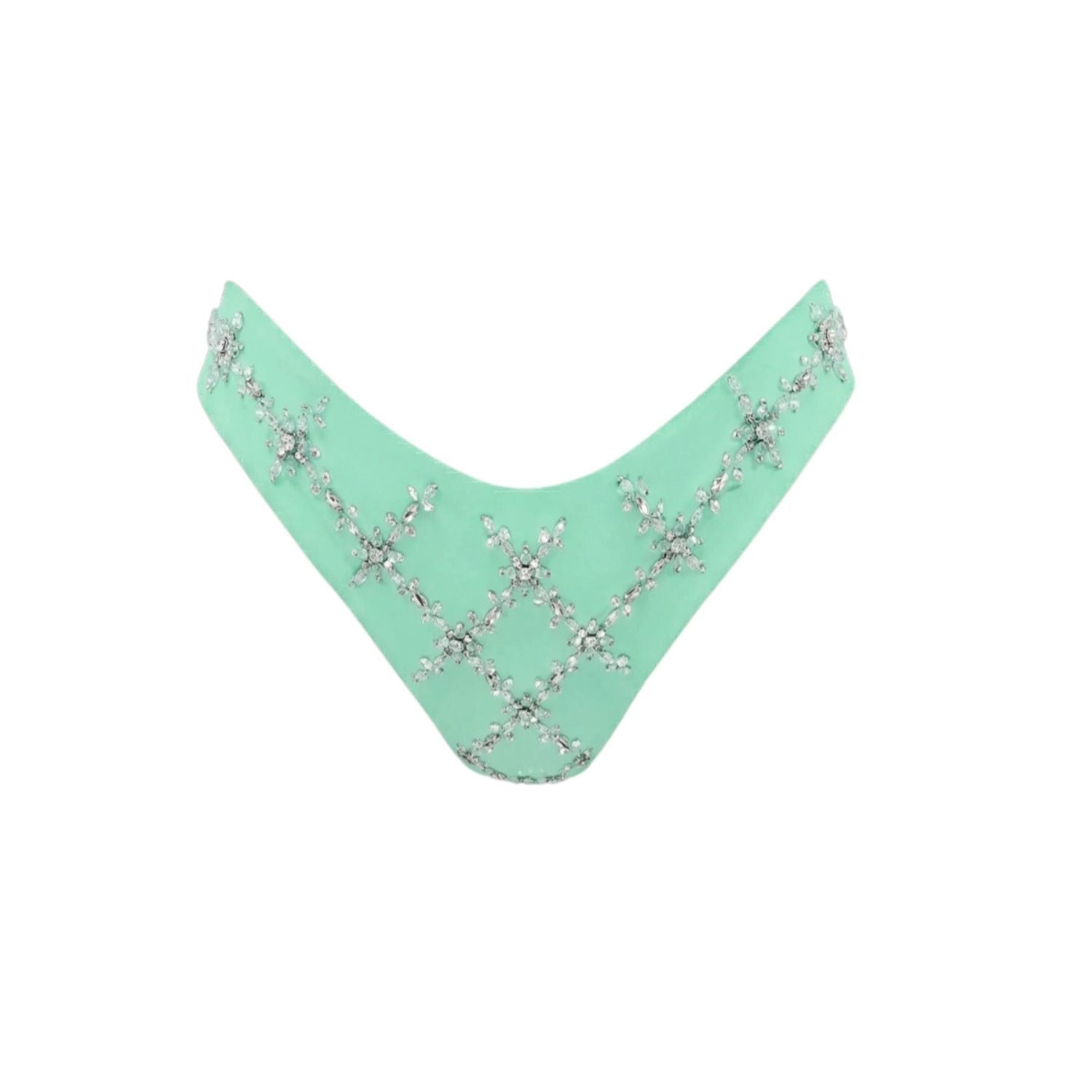 This bikini bottom is designed with a sleek, mid-rise fit that sits comfortably on the hips. Featuring the same crystal-style embellishments in a geometric pattern, it adds a refined touch of sparkle while maintaining a clean and modern silhouette. Ideal for effortless mix-and-match or as part of a coordinated set.