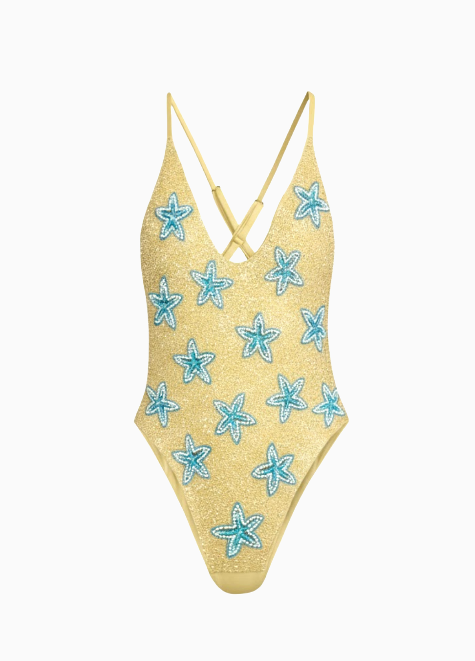 Make a bold splash with this one-piece swimsuit featuring an eye-catching starfish motif and shimmering textured finish. Designed with a flattering deep V neckline, adjustable shoulder straps, and high-cut legs, it beautifully enhances your natural silhouette while offering comfortable support. The stretchy, body-hugging fabric ensures a secure fit whether you’re lounging poolside or diving into the waves. A perfect blend of playful seaside charm and high-fashion swimwear style—ideal for beach getaways, pool parties, and summer vacations.