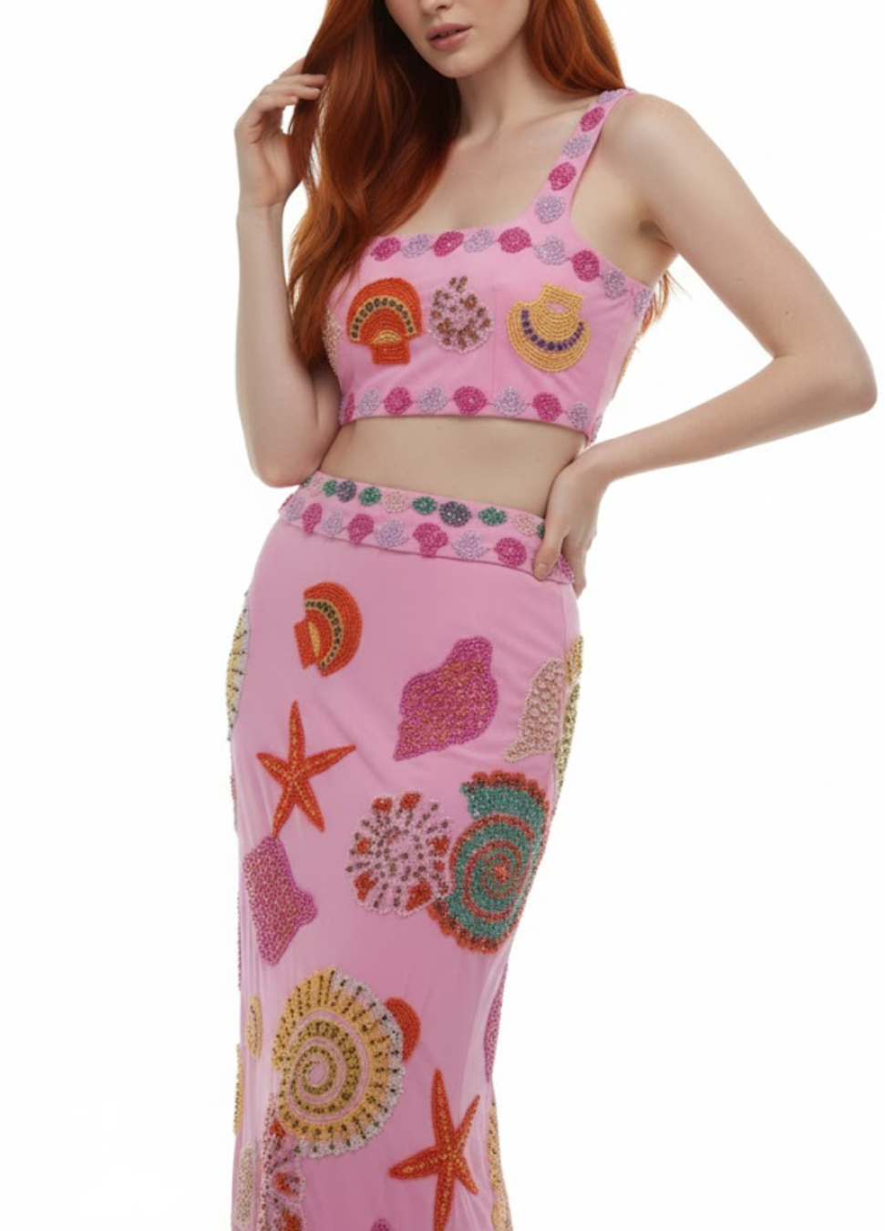 Elevate your resort wardrobe with the New York Shell Hand-Embroidered Top in Pink. Crafted on eco-friendly power mesh, this luxury designer crop top is entirely hand-embroidered with shimmering crystals and sea life motifs. Each piece takes a full day for our London artisans to complete, making it a true work of wearable art. Perfect for resort wear, holiday parties, and festival looks, this sustainable statement top is as timeless as it is glamorous.