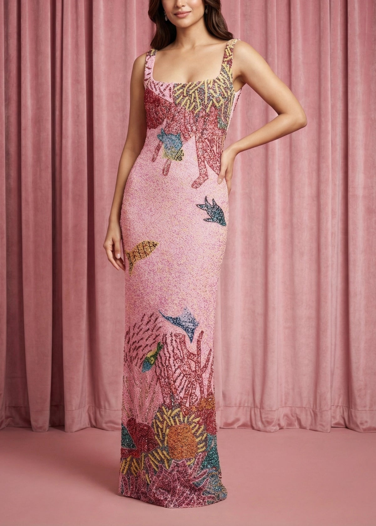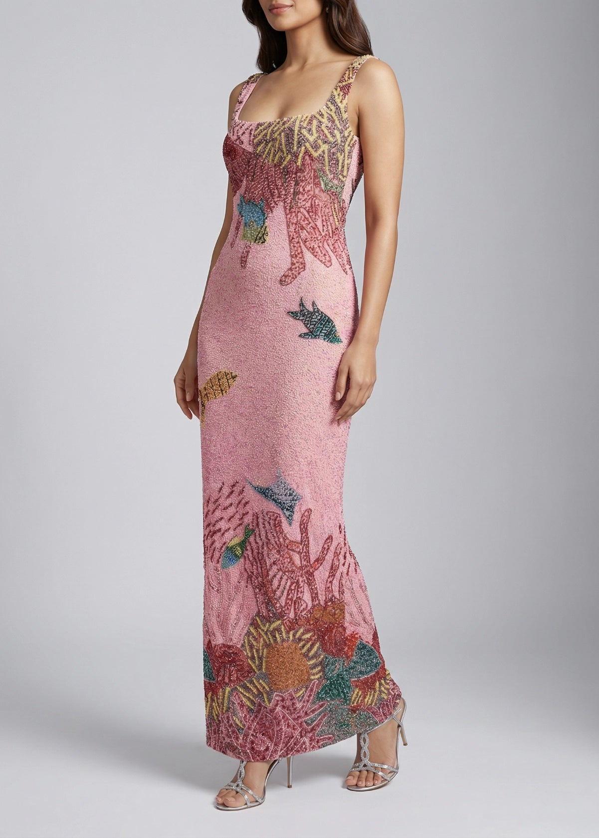 Immerse yourself in vibrant, ocean-inspired elegance with this hand-embellished pink gown. Crafted with luxurious beadwork and intricate coral-reef motifs, the dress glimmers with multicolored details that echo the beauty of underwater life. The fitted silhouette highlights the figure with effortless grace, while the rich texture and sparkling finish bring a couture touch to every moment. Perfect for special occasions, evening events, or statement editorials, this gown is a wearable piece of art designed to captivate from every angle.