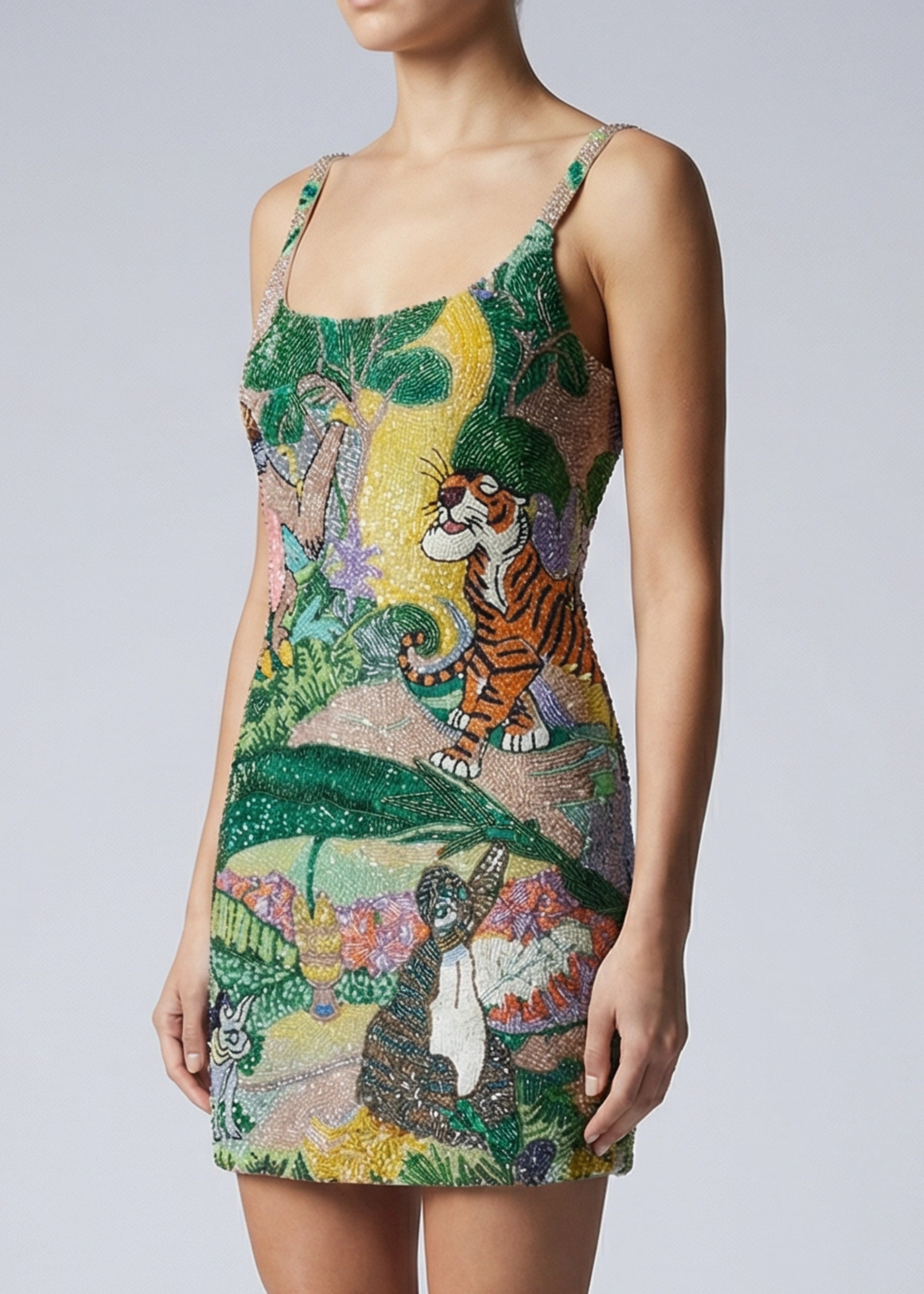The fitted silhouette tapers to a mini length, balancing drama with wearability for resort evenings or statement occasions.