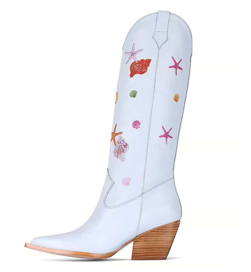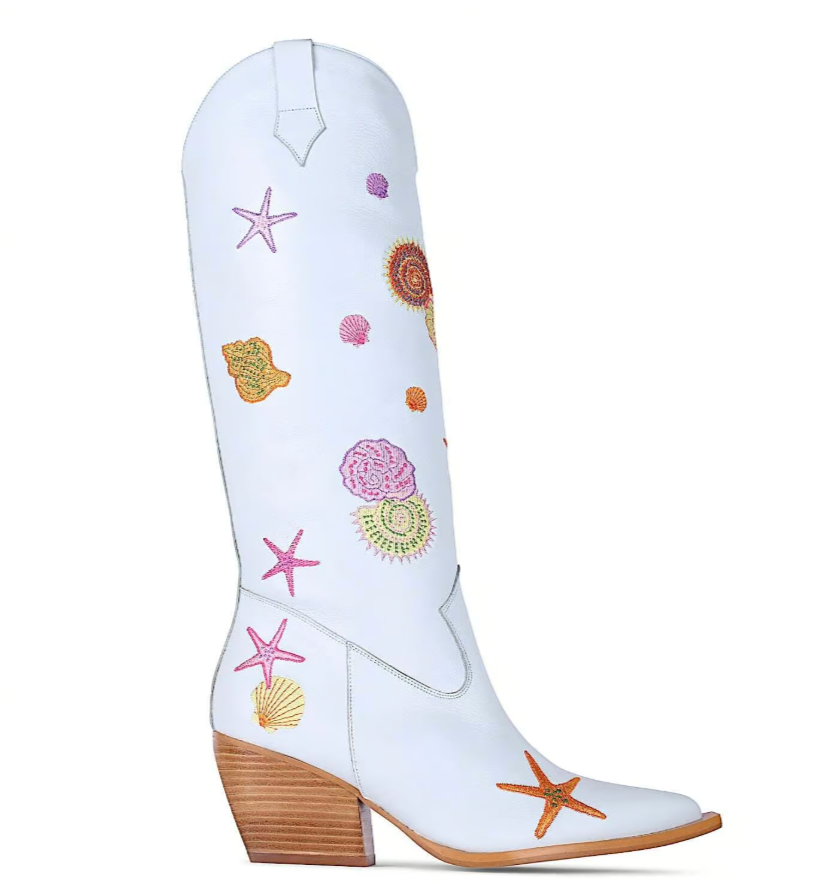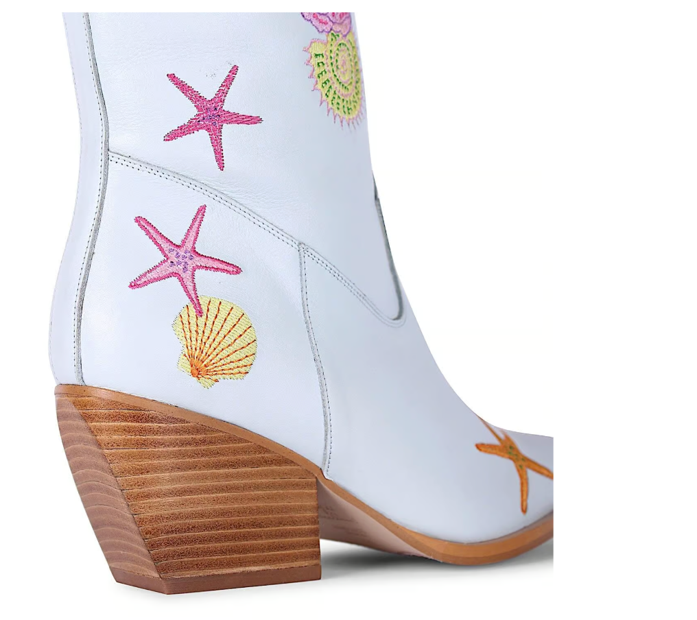 Channel mermaid energy with this ocean blue statement boot, embroidered with sea life symbols in a tonal matte thread. Designed to feel like wearable ocean art, the soft pastel leather contrasts beautifully with a natural tan sole and heel. A nostalgic nod to disco-era fashion, made modern with purpose and power.