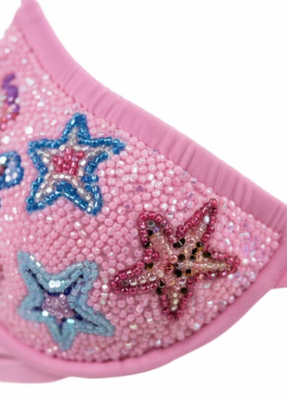 Dive into oceanic charm with our  صوت Sout underwire bikini. Crafted in a pink hue, this two-piece bikini captures the magic of the sea with intricate embroidered details featuring starfish, seashells, seahorses, and tropical fish.