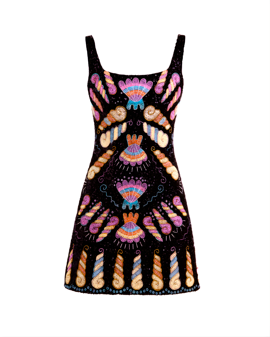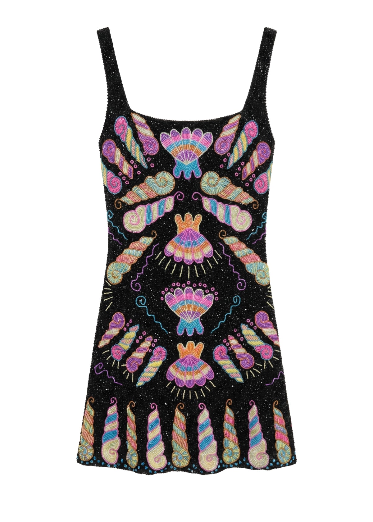 Luxury hand-beaded white mini dress, designed in collaboration with Zandra Rhodes. This black embellished mini dress features vibrant, hand-beaded shell and sea-inspired motifs in rich hues of purple, coral, turquoise, and gold — a signature of Zandra Rhodes’ bold, expressive style. A show-stopping resortwear piece ideal for bridal beach events, soirées and vacation party looks. Made in black with striking shell design.