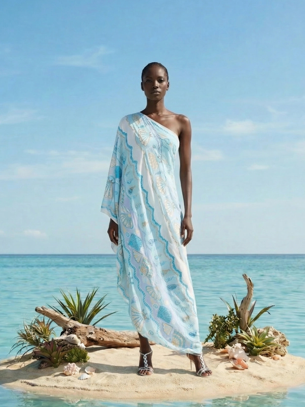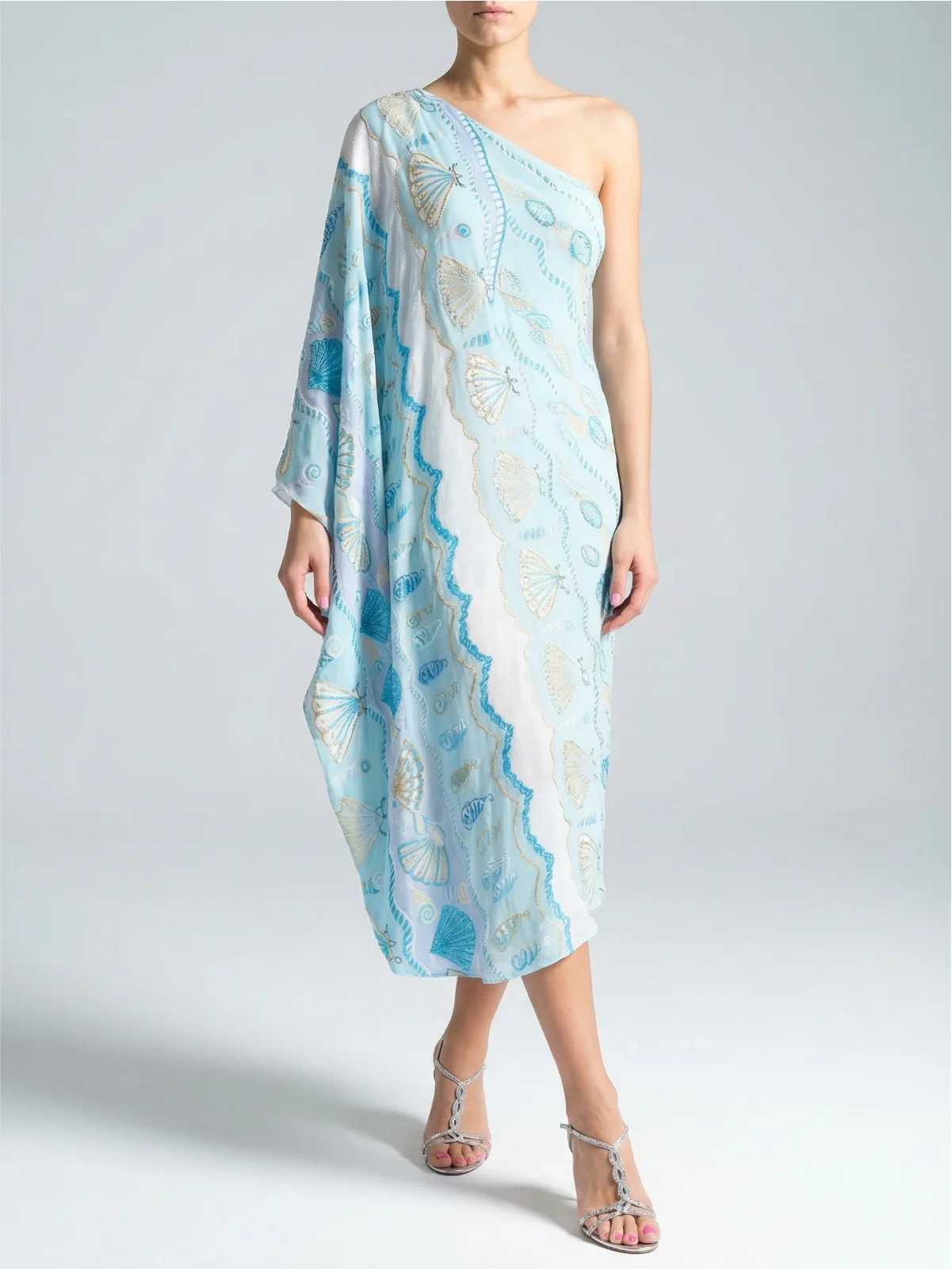 Embrace timeless seaside elegance with this blue silk one-shoulder kaftan from the Oceanus x Zandra Rhodes collection. Featuring exquisite gold and turquoise embroidered shell motifs, this flowing silhouette captures the essence of luxury resort wear. Crafted from the finest silk, it offers effortless movement and sophistication — perfect for glamorous beachside dinners, summer escapes, or destination events.