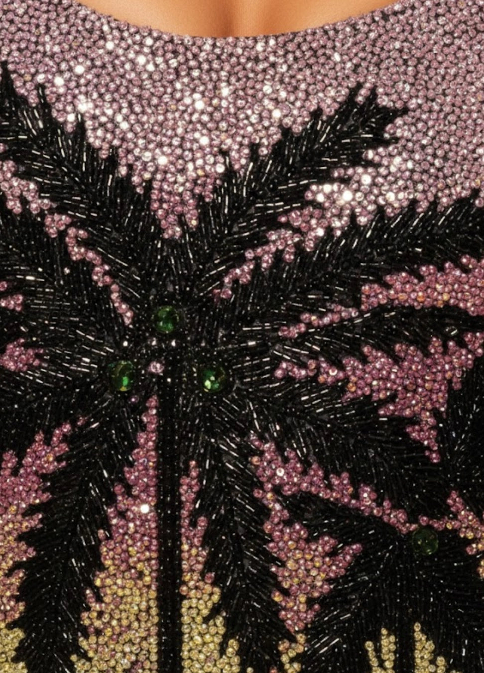 Shine at the beach or pool in the Palm Dusk Black Scoop Swimsuit, a show-stopping design featured at Miami Swim Week SS25. Handmade in London from beaded lycra, this luxury one-piece swimsuit features intricate palm tree beadwork, a flattering scoop neckline, and elegant fit. The ultimate choice for designer swimwear lovers.