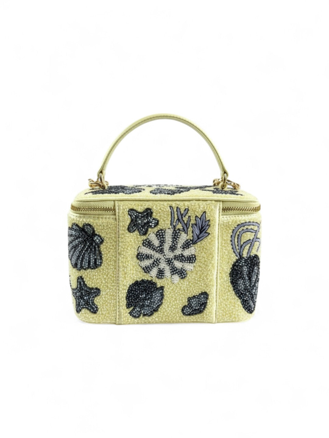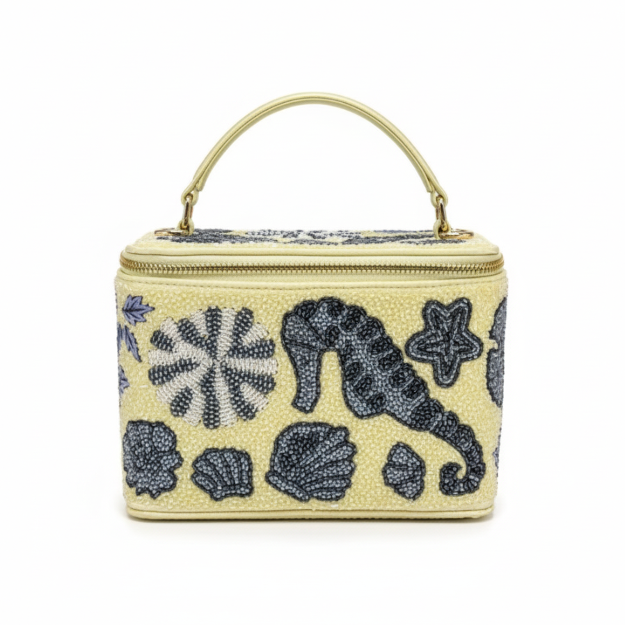 This chic vanity-style bag features a built-in mirror and a detachable shoulder strap, beautifully adorned with hand-embellished sea creatures. A perfect blend of elegance and craftsmanship, it’s your new statement accessory for any occasion.