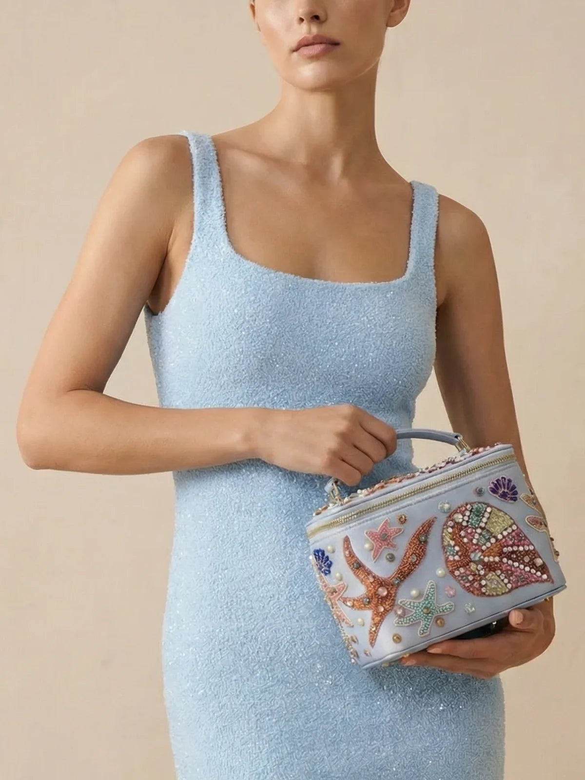 Dive into ocean-inspired elegance with this beautifully handcrafted vanity case. Featuring intricate beadwork of seashells, starfish, and coral motifs, this pastel-blue case captures the charm of the sea with shimmering pearls and gemstones. Designed with a sturdy handle and a full zip closure, it’s perfect for storing your beauty essentials or jewelry in style. Whether at home or on your travels, this statement piece adds a touch of luxury and whimsy to your collection.
