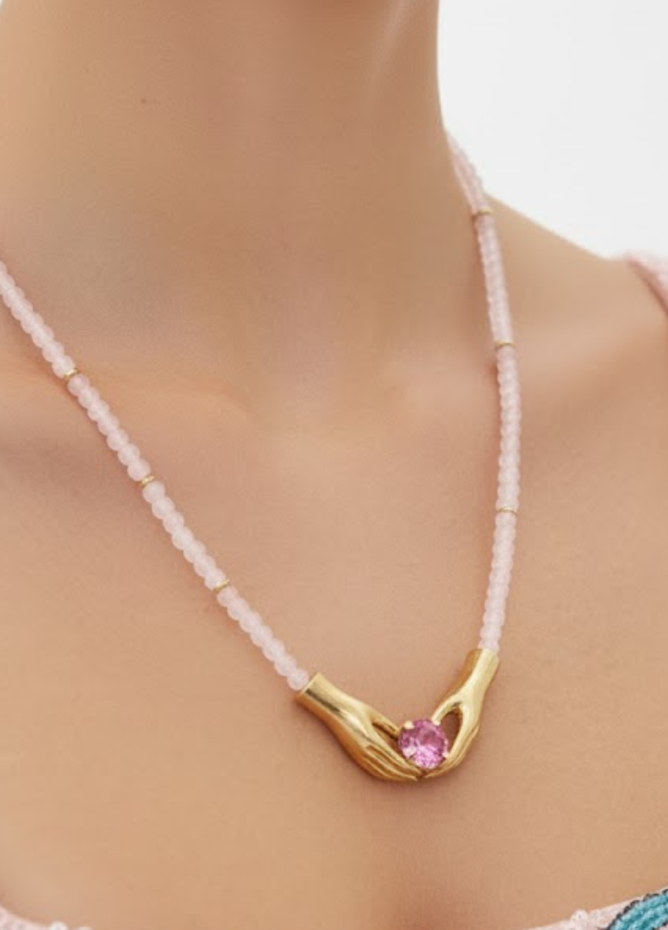 Sculptural statement necklace featuring gold-tone hands holding a rose gemstone, accented with pink beads. A unique and symbolic luxury necklace perfect for evening wear, art-inspired jewellery collections, and designer gifting.