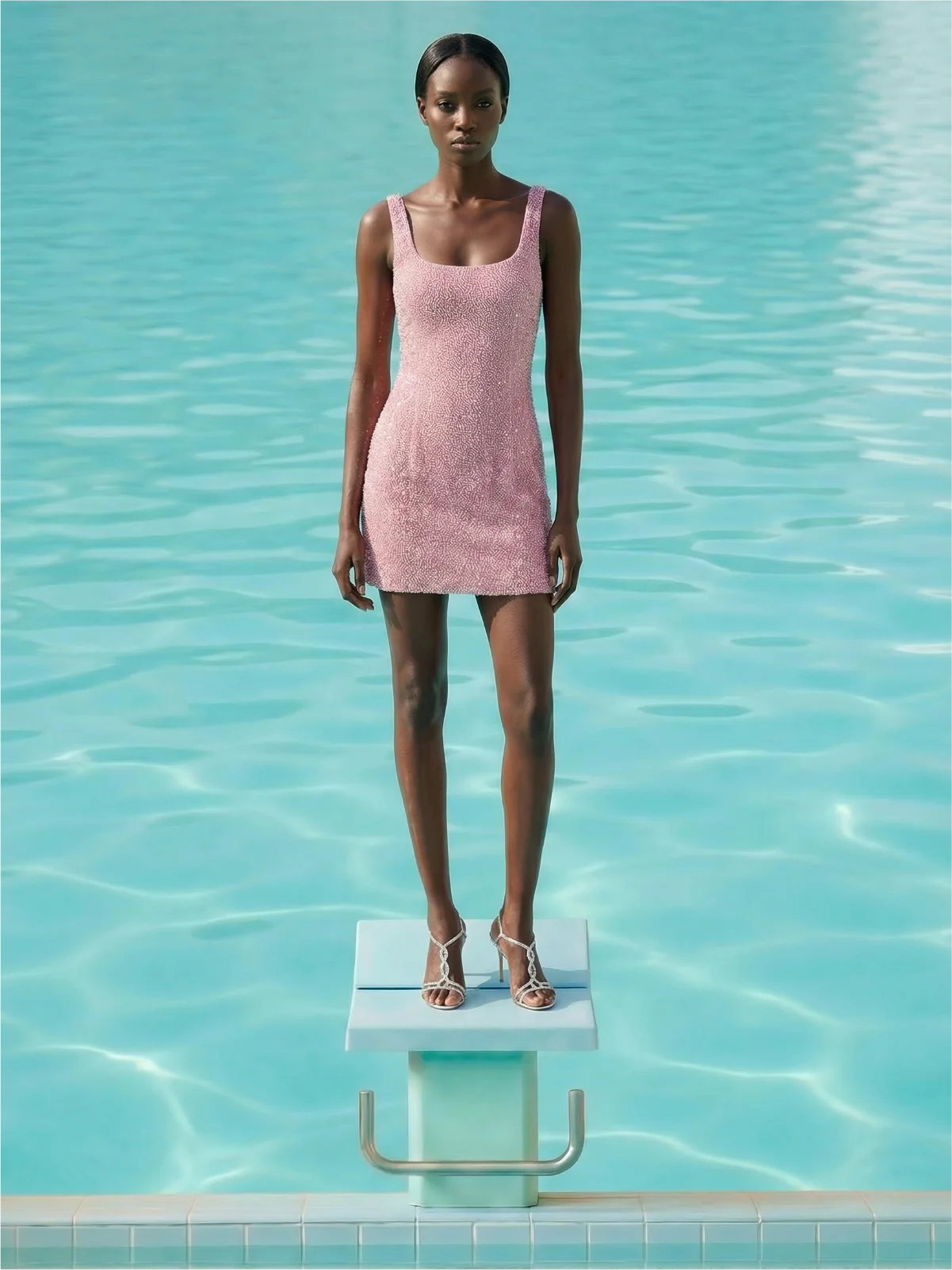 Make an unforgettable entrance in the Sofia Hand Beaded Pink Dress, a luxurious bridal party dress crafted on a lightweight power mesh base.