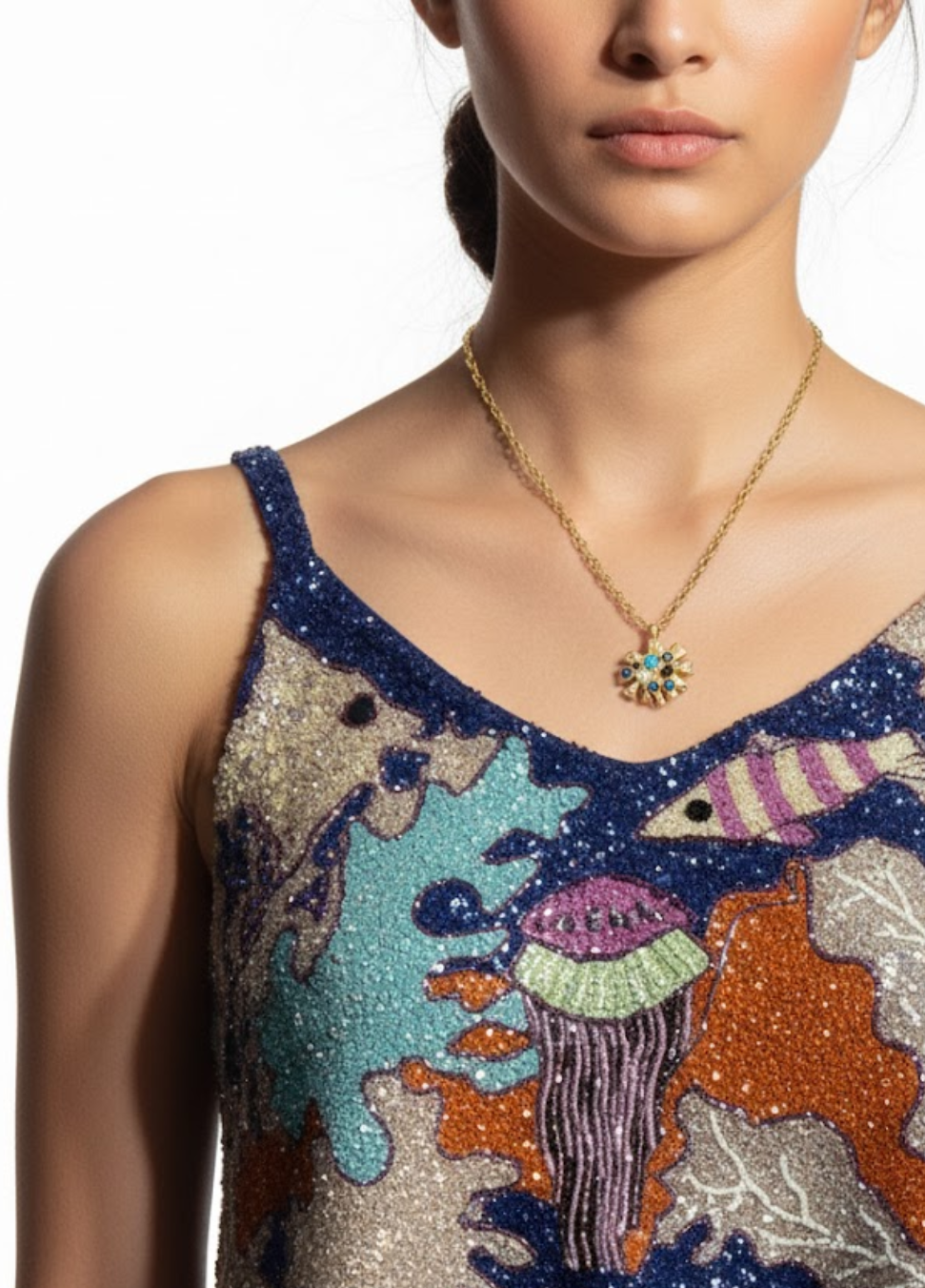 Striking blue crystal sunburst necklace with a gold-tone chain, designed for tropical resort outfits, evening events, and summer party styling.