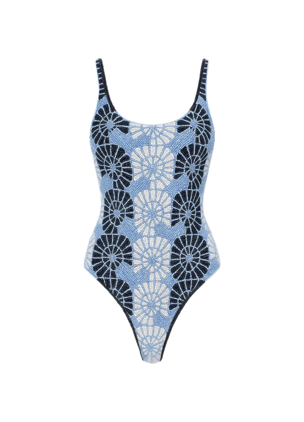 The Swirlshell Beaded One Piece Swimsuit is a show-stopping collaboration between Oceanus and Zandra Rhodes. Crafted from luxe Lycra and adorned with hand-beaded swirls and shell motifs, this designer swimsuit offers a flattering scoop fit and high-fashion edge. Perfect for luxury resort wear, exclusive beachwear, and runway-ready swim fashion.