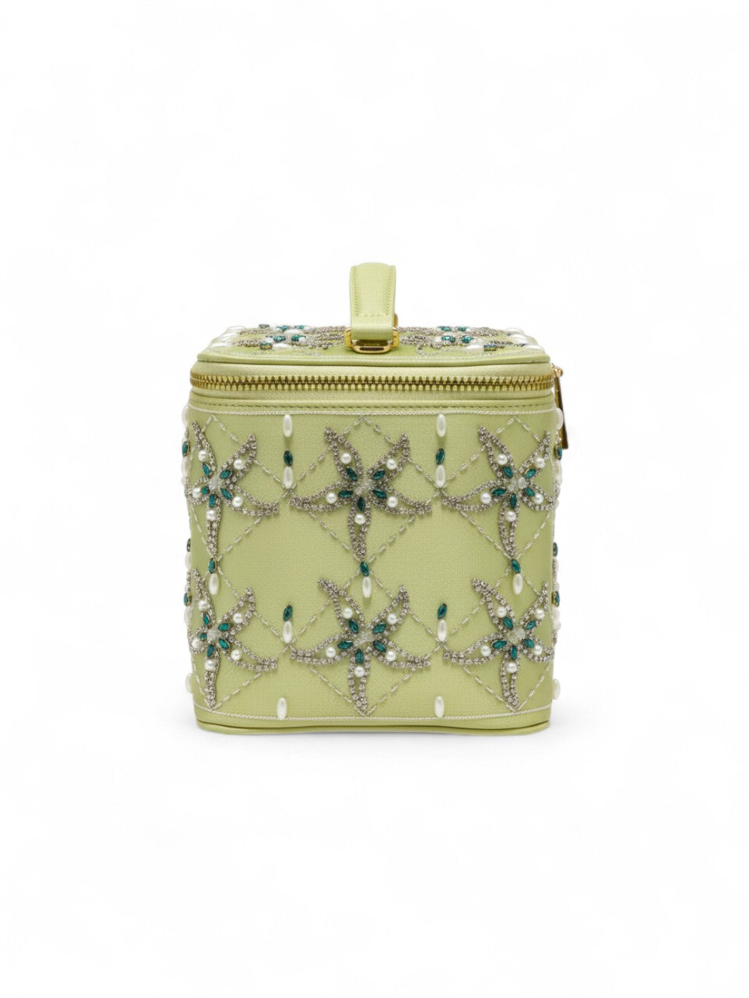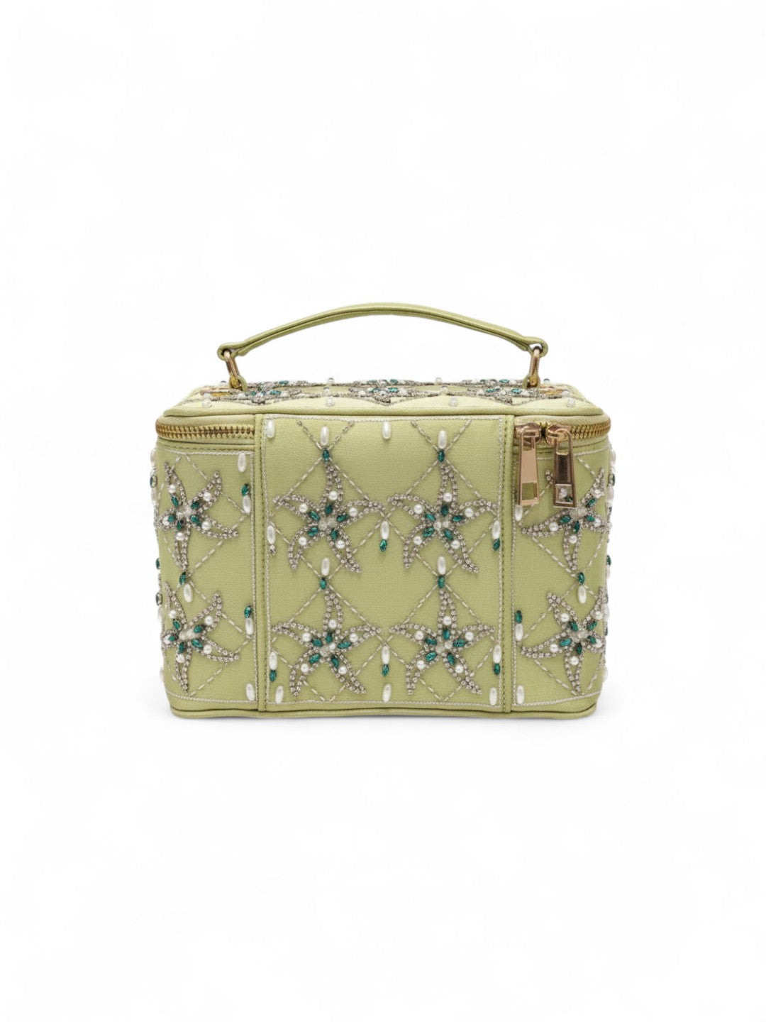 This chic vanity-style bag features a built-in mirror and a detachable shoulder strap, beautifully adorned with hand-embellished elements. A perfect blend of elegance and craftsmanship, it’s your new statement accessory for any occasion.