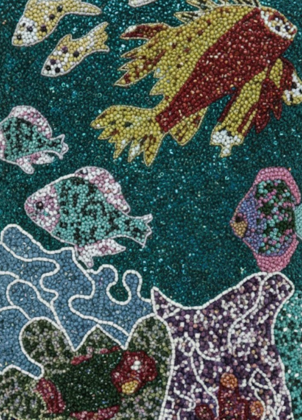 This sea life-inspired dress evokes the vibrant underwater world of the Persian Gulf. The dress is adorned with shimmering glass beading, intricately designed to resemble corals, shells, and marine life. The rich hues of deep coral, aquamarine, soft peach, and emerald green evoke the colors of the sea, while delicate beadwork adds texture and dimension, mimicking the intricate patterns found in marine ecosystems.