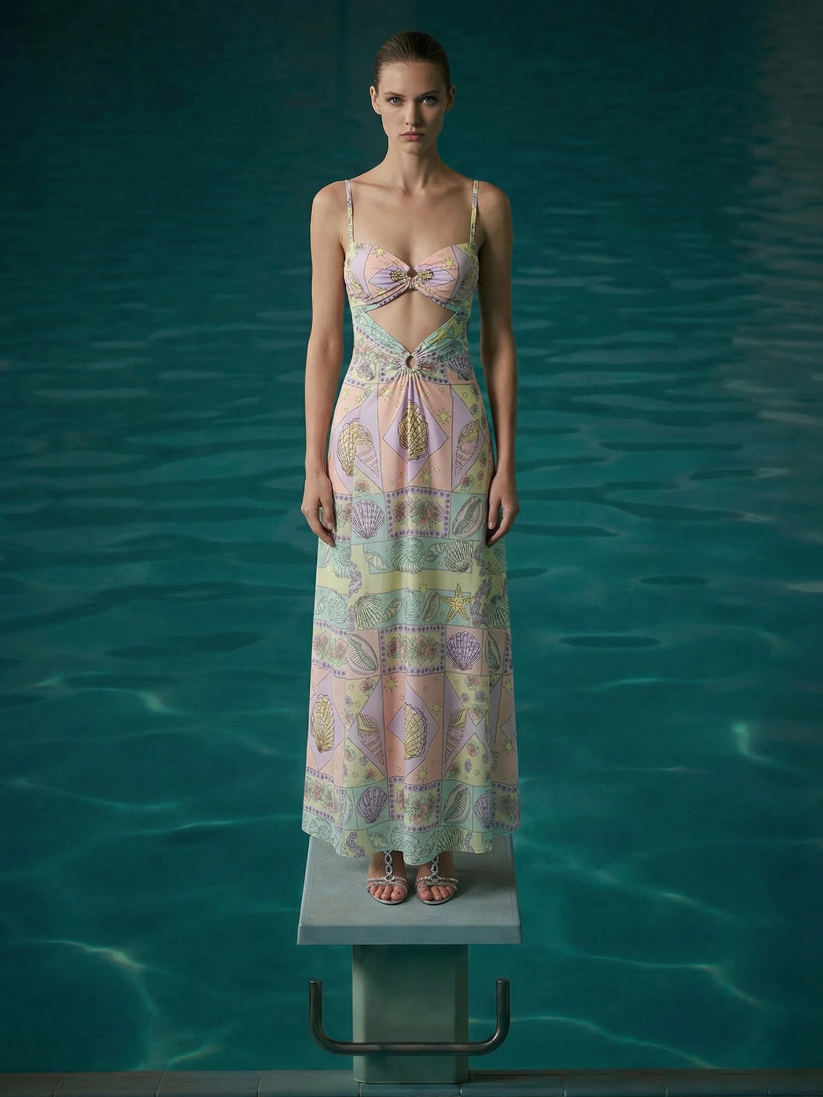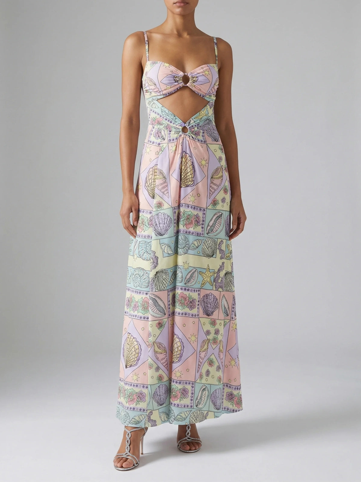 The eye-catching cut-out detail at the neckline is accented with a statement ring embellishment, adding a subtle yet sophisticated focal point. Its flowing maxi-length skirt drapes beautifully, creating graceful movement with every step. The intricate patchwork-inspired print in soft lilac, blush, mint, and cream tones brings a charming vintage-meets-modern aesthetic.